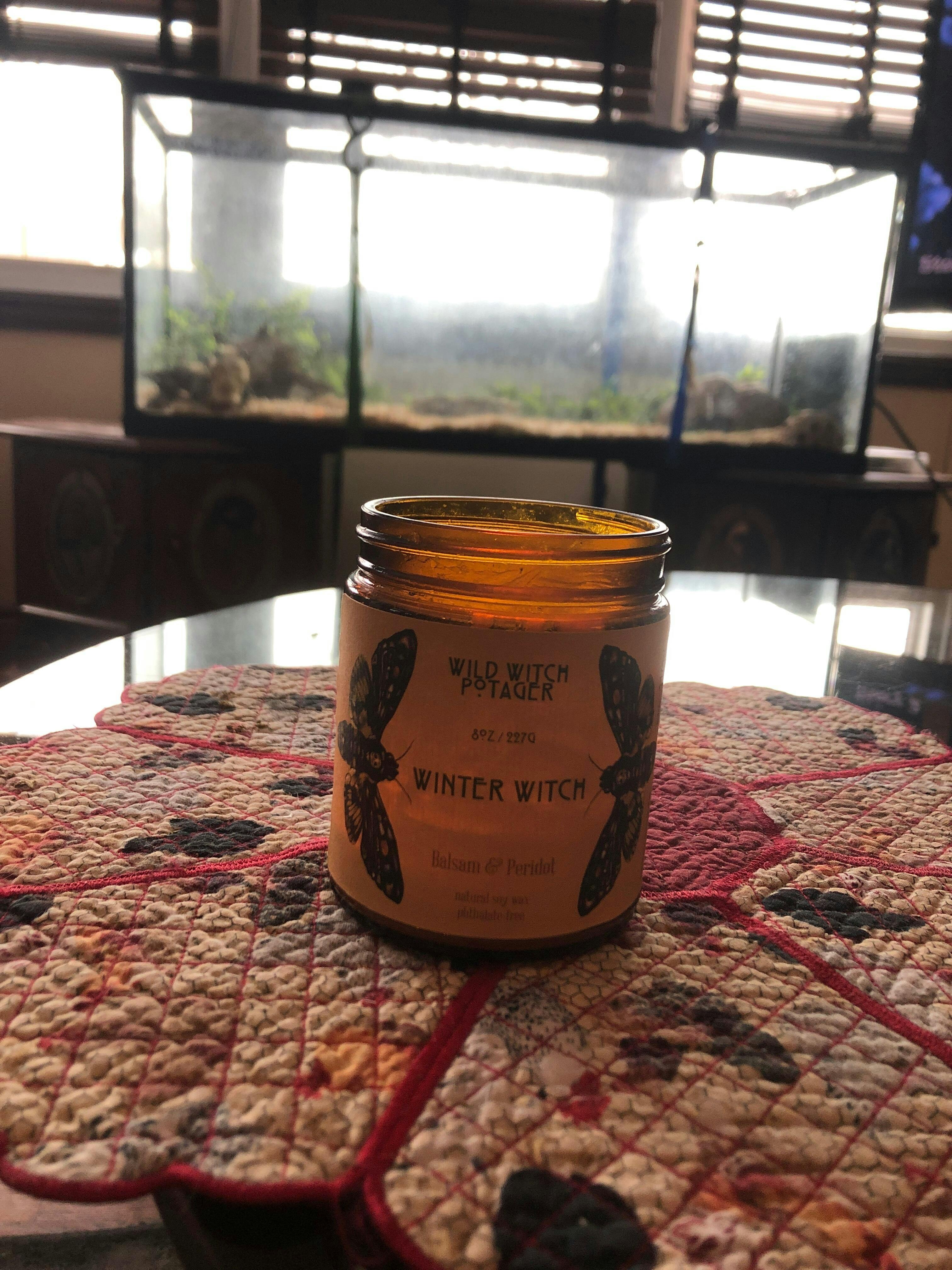 Each candle is dressed with rosemary, moss and rough green peridot crystals to bring strength to overcome.